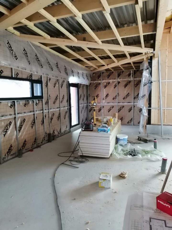 Réalisation d’isolation avec membrane d’étanchéité à l’air en doublages et plafonds avec un objectif de perméabilité à l’air de 0,2 en m³.h¯¹.m¯² (en Q4PA-Surf) exigé. Résultat obtenu : 0,14 m³.h¯¹.m¯² !