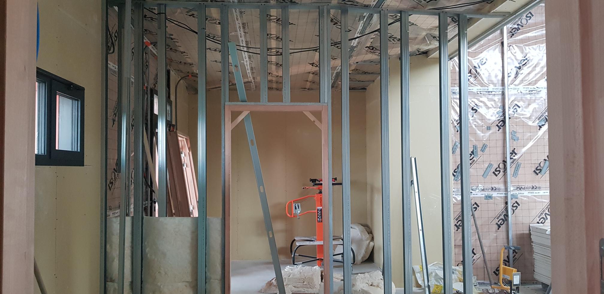 Réalisation également de doublages acoustiques avec plaques perforées Rigitone, de cloisons placostil 98/62 + SAA 140 et de plafonds coupe-feu.