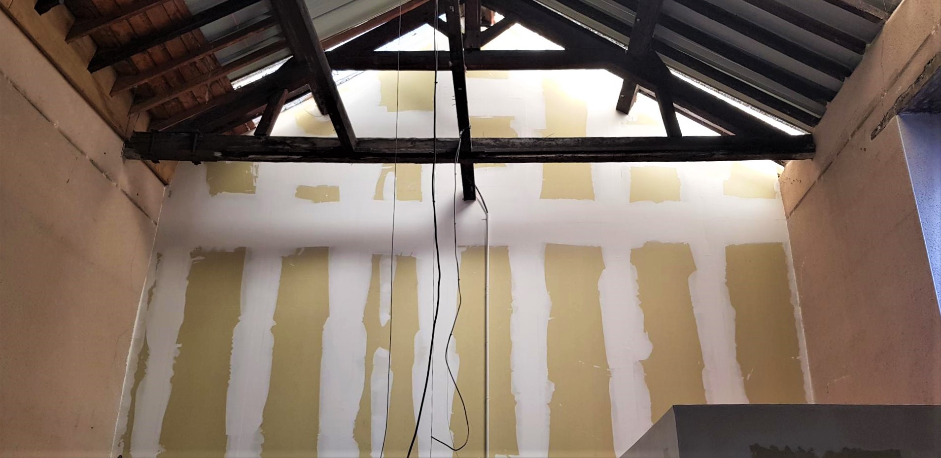 Réalisation d'une cloisons sèches grande hauteur (jusqu'à 7 mètres 80) en montant 150 GH de chez Placo et 1 BA 18 par parement pour un coupe-feu 1 heure.